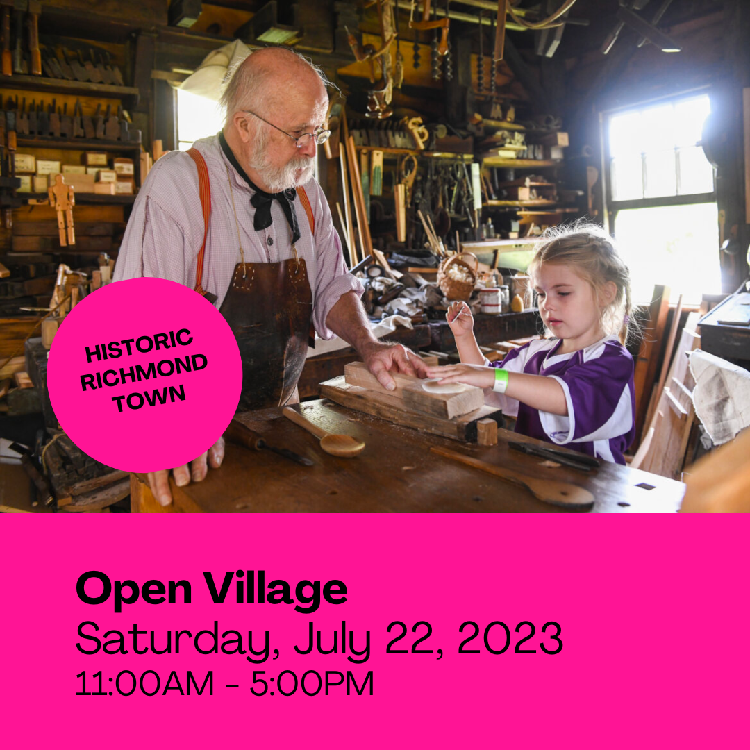 Step back in time and experience the open village at Historic Richmond Town! The campus zones interpret life in the 1770s, 1820s, and 1860s. Historic trades are displayed in shops, and domestic life is shown inside historic homes.