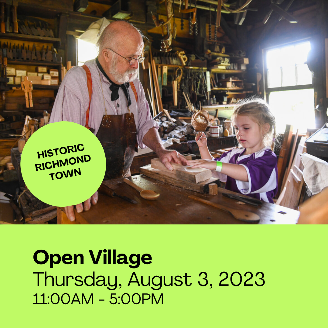 Step back in time and experience the open village at Historic Richmond Town! The campus zones interpret life in the 1770s, 1820s, and 1860s. Historic trades are displayed in shops, and domestic life is shown inside historic homes.