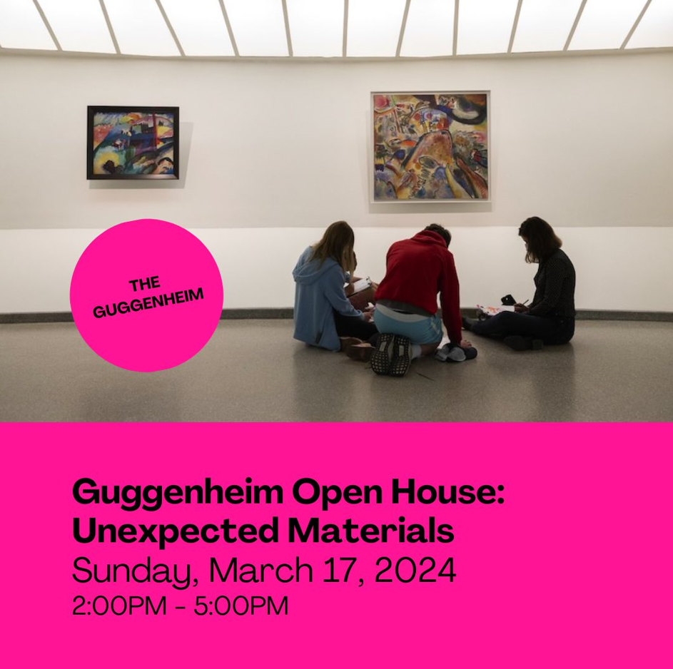 This month, investigate how artists use unexpected materials in the exhibitions Going Dark: The Contemporary Figure at the Edge of Visibility and By Way Of: Material and Motion in the Guggenheim Collection. Come to the open house for artistic explorations for all ages, playful story time for younger art lovers, and more technique-focused, sketching and studio sessions for teens highlighting sustainable practices.